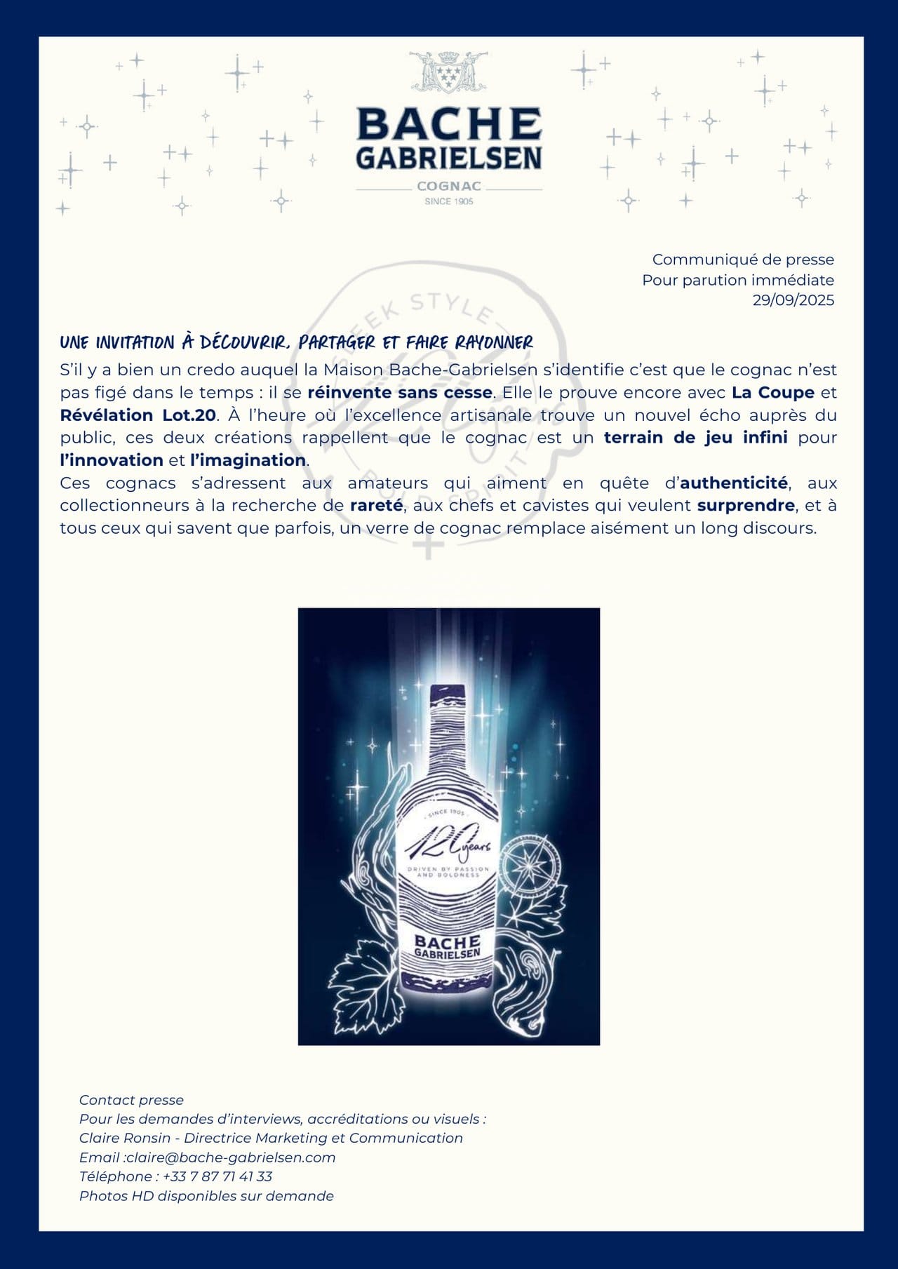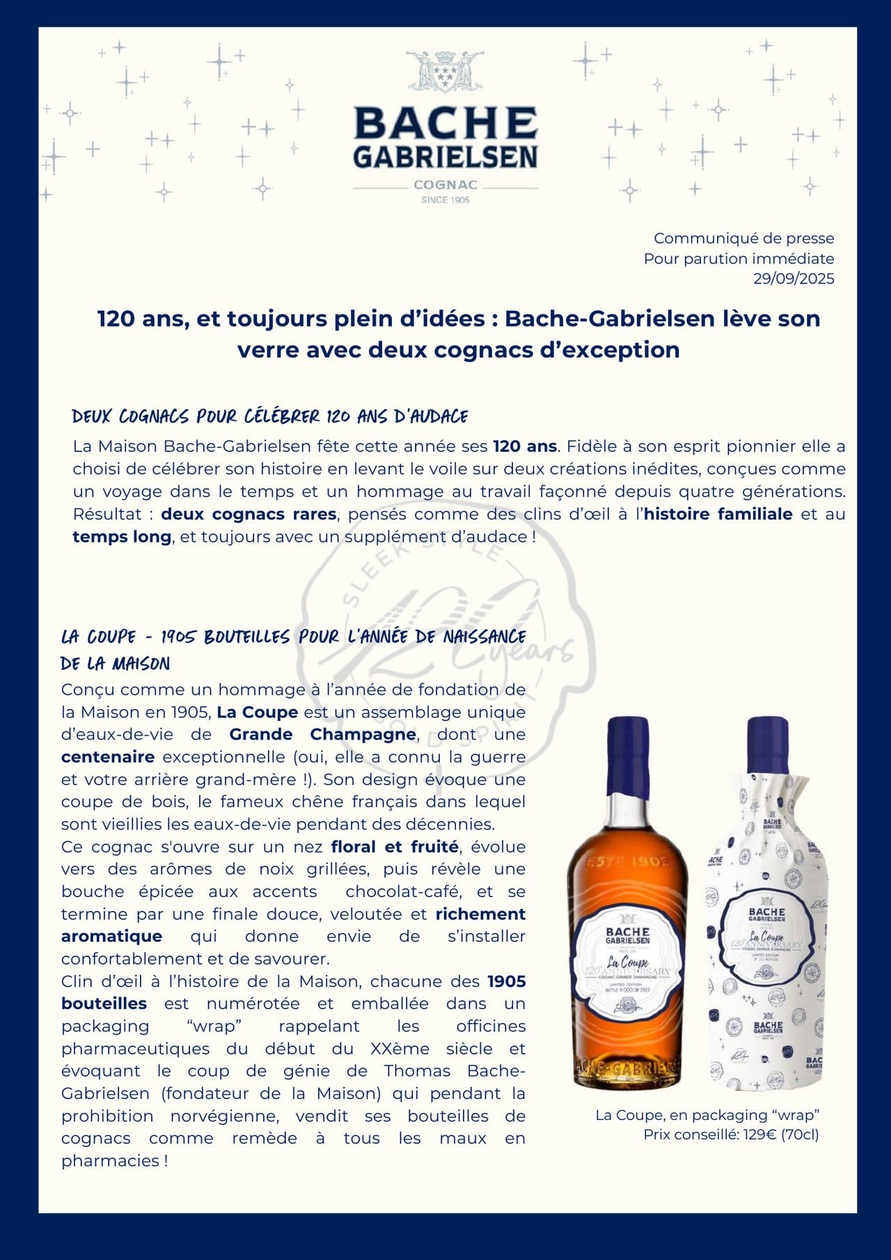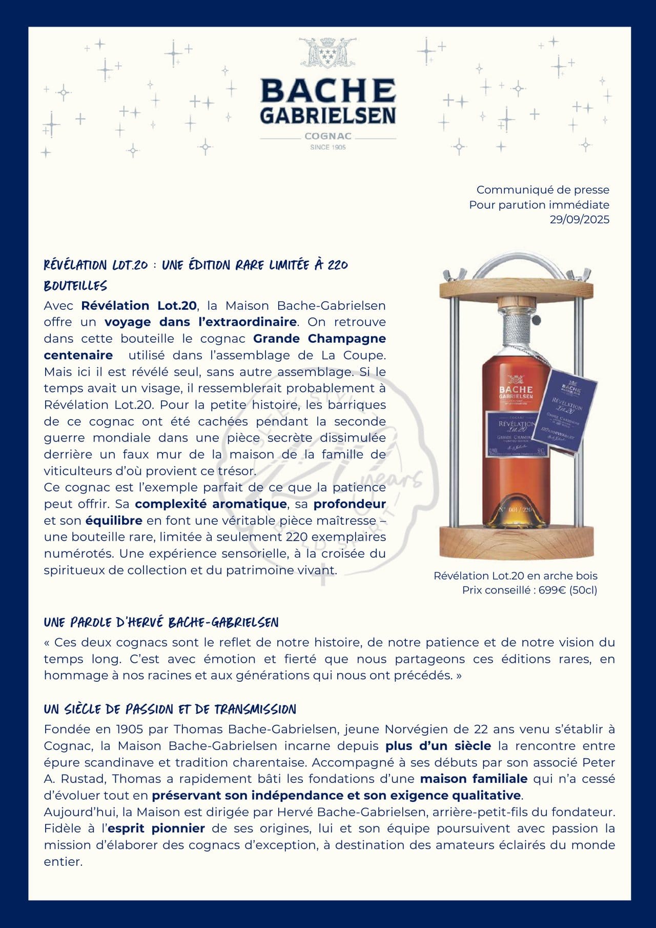 Bache-Gabrielsen célèbre ses 120 ans avec deux cognacs d'exception : La Coupe, un assemblage de Grande Champagne incluant une eau-de-vie centenaire, limité à 1905 bouteilles numérotées ; et Révélation Lot.20, un cognac Grande Champagne centenaire, limité à 220 flacons.
