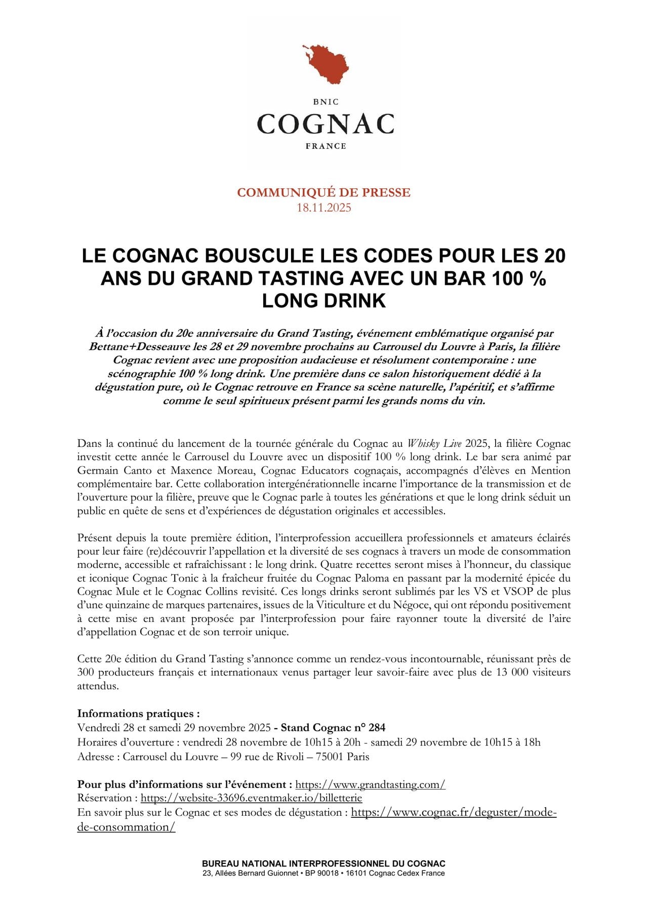 À l'occasion du 20e anniversaire du Grand Tasting, événement emblématique organisé par Bettane+Desseauve les 28 et 29 novembre prochains au Carrousel du Louvre à Paris, la filière Cognac revient avec une proposition audacieuse et résolument contemporaine : une scénographie 100 % long drink. Une première dans ce salon historiquement dédié à la dégustation pure, où le Cognac retrouve en France sa scène naturelle, l'apéritif, et s'affirme comme le seul spiritueux présent parmi les grands noms du vin.