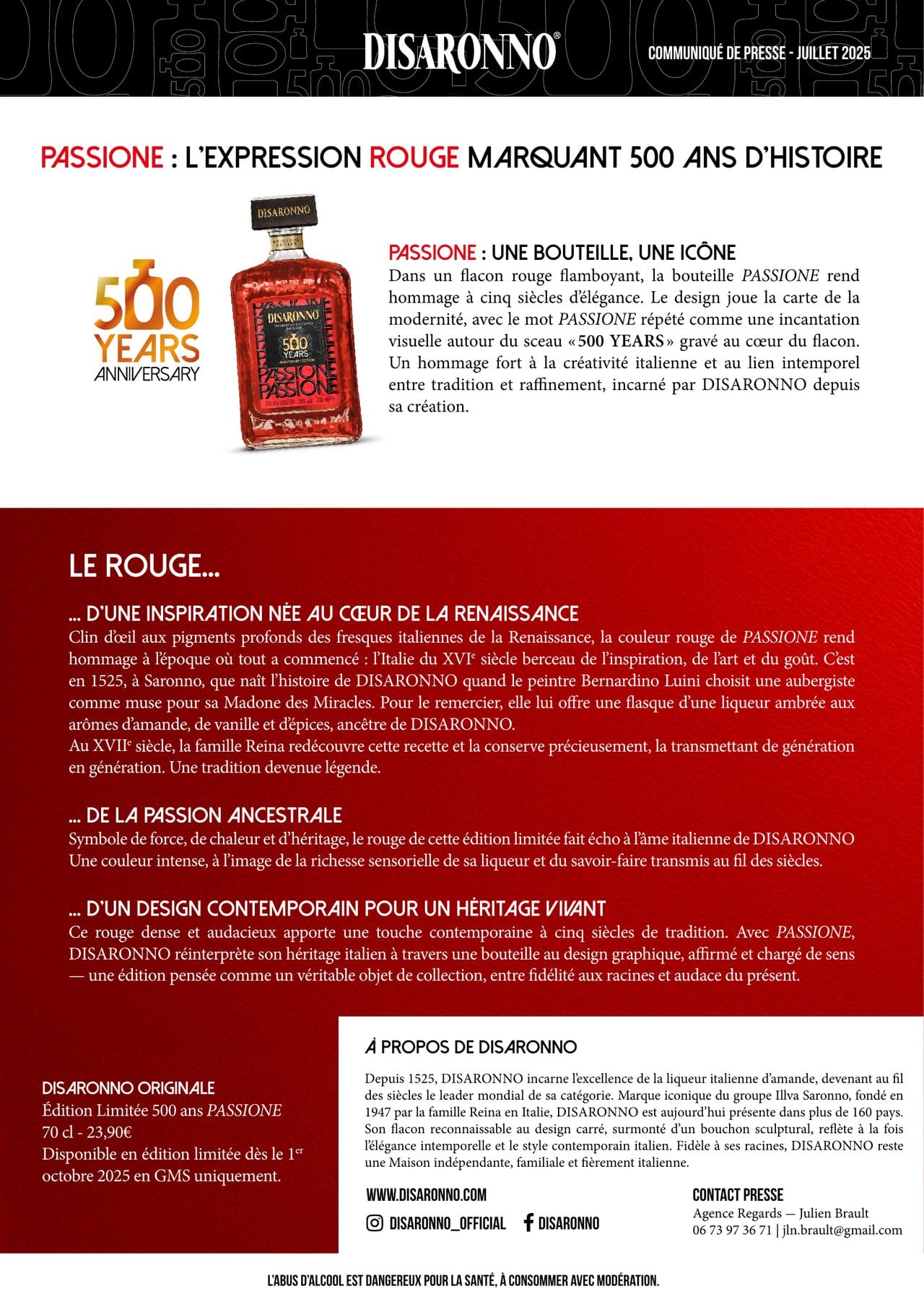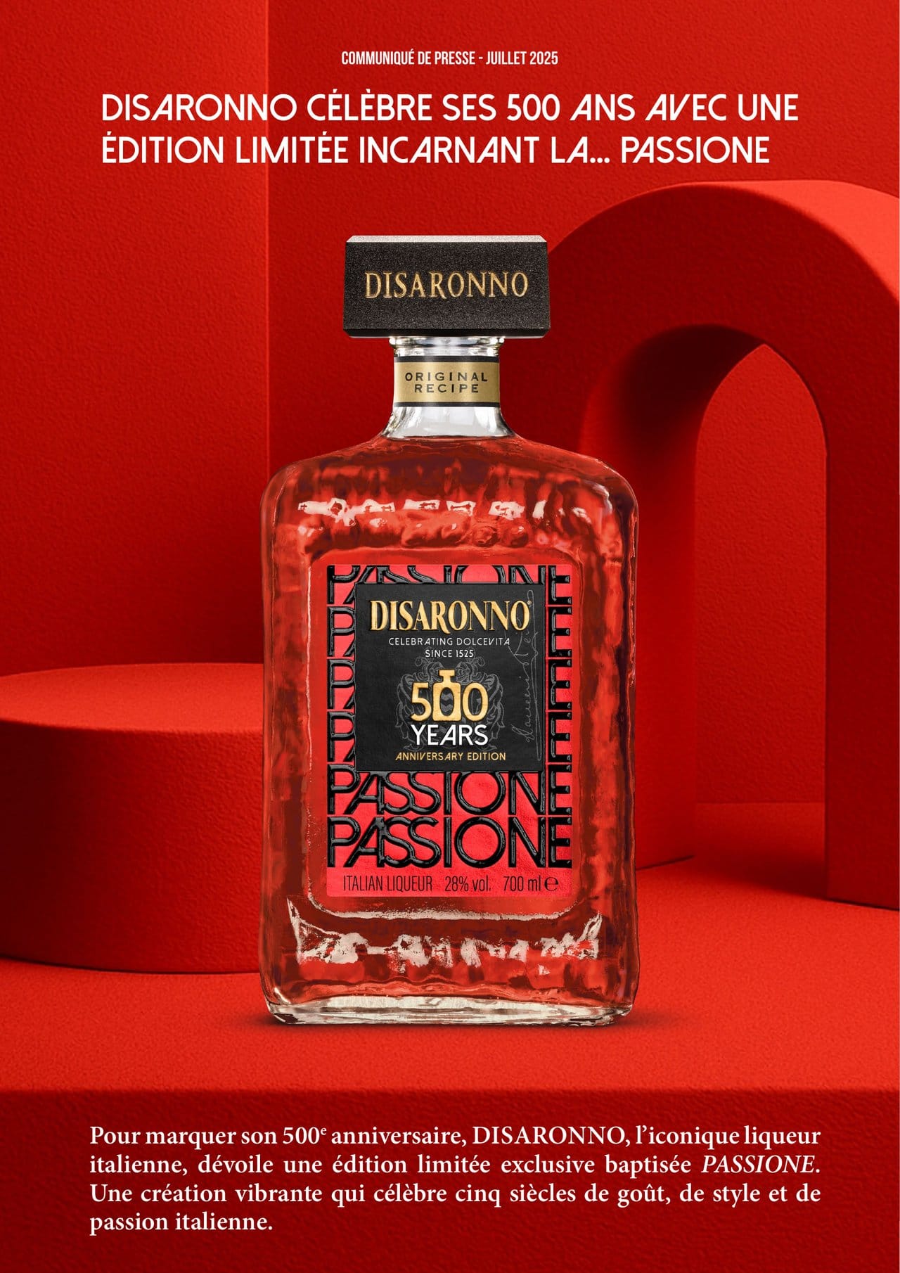 Pour marquer son 500e anniversaire, DISARONNO, l'iconique liqueur italienne, dévoile une édition limitée exclusive baptisée PASSIONE. Une création vibrante qui célèbre cinq siècles de goût, de style et de passion italienne.