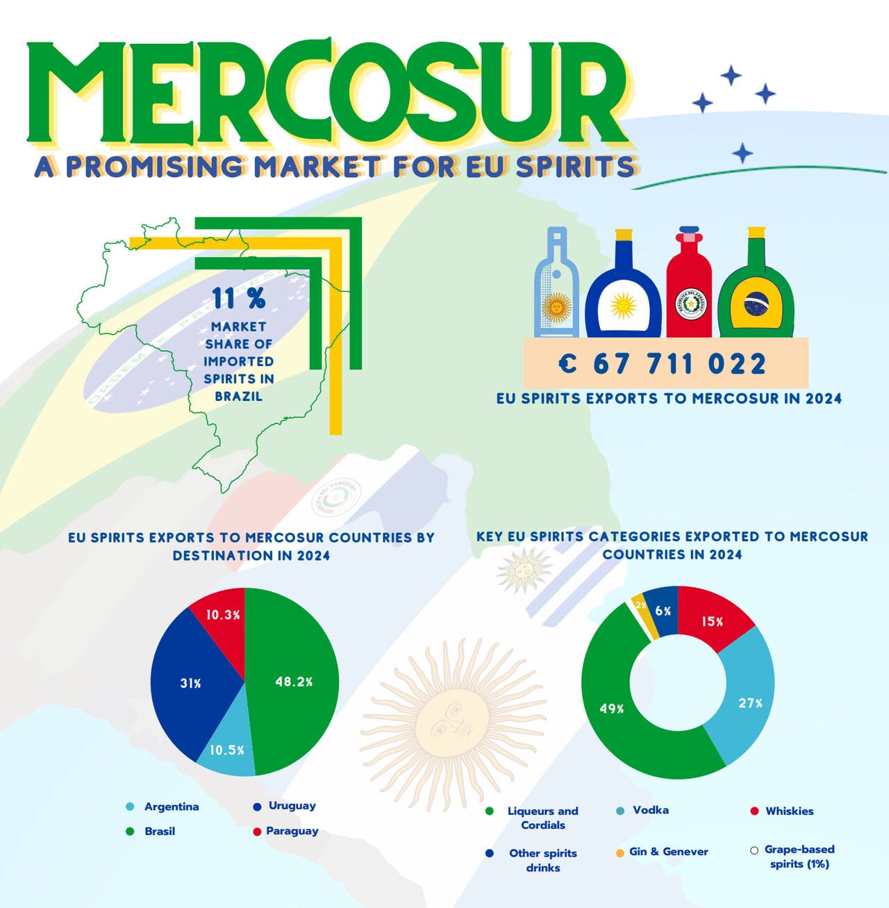 spiritsEUROPE, parmi 26 associations commerciales européennes, a appelé de nouveau cette semaine à la ratification rapide de l'accord UE-Mercosur. Selon l'organisation (qui en a profité pour partager une infographie sur le sujet), ce traité permettrait d'éliminer les droits de douane (jusqu'à 20%) sur les spiritueux européens d'ici 4 ans, leur offrant un avantage compétitif majeur sur les marchés sud-américains - Source