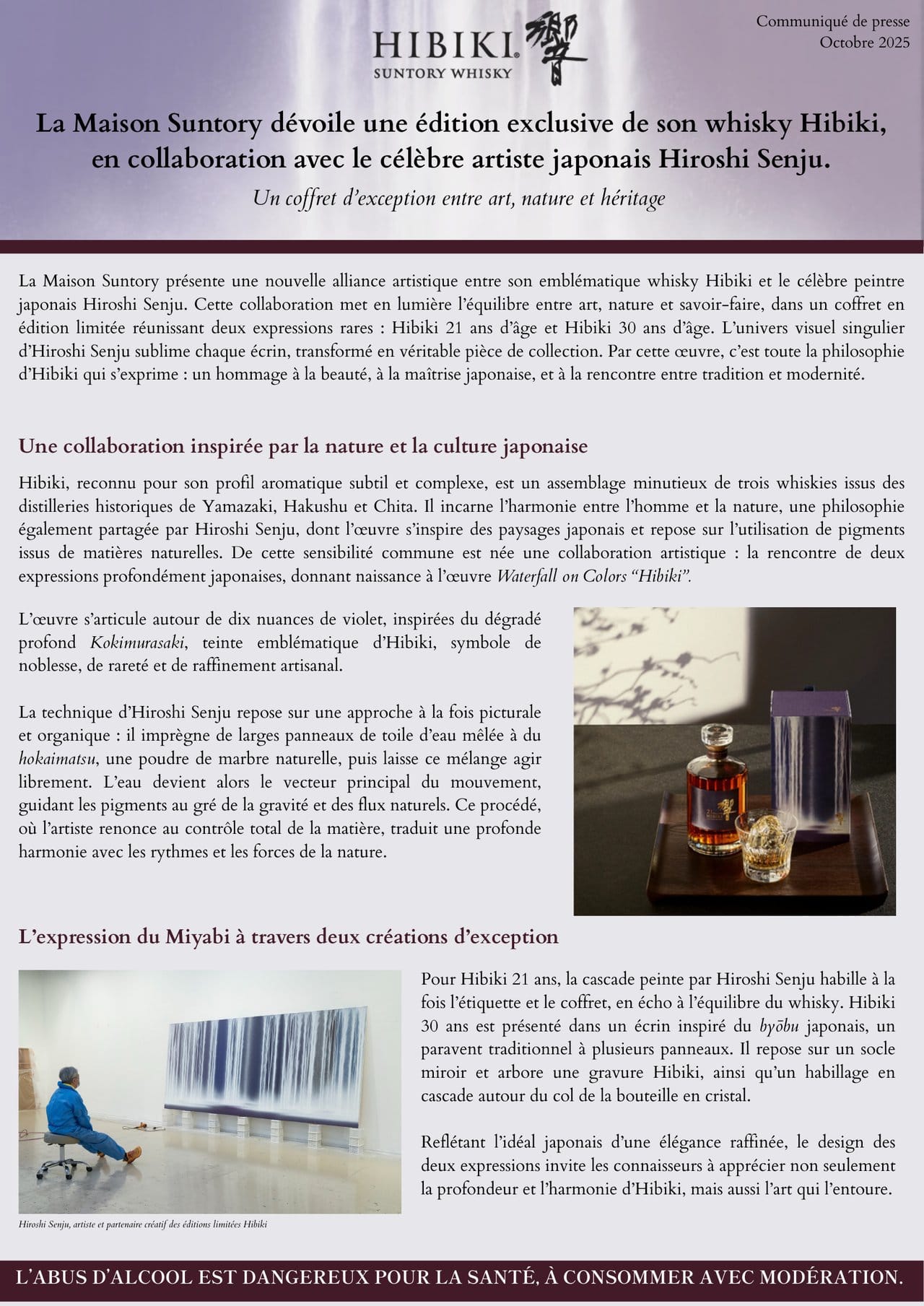 La Maison Suntory présente une nouvelle alliance artistique entre son emblématique whisky Hibiki et le célèbre peintre japonais Hiroshi Senju. Cette collaboration met en lumière l'équilibre entre art, nature et savoir-faire, dans un coffret en édition limitée réunissant deux expressions rares : Hibiki 21 ans d'âge et Hibiki 30 ans d'âge. L'univers visuel singulier d'Hiroshi Senju sublime chaque écrin, transformé en véritable pièce de collection. Par cette œuvre, c'est toute la philosophie d'Hibiki qui s'exprime : un hommage à la beauté, à la maîtrise japonaise, et à la rencontre entre tradition et modernité.