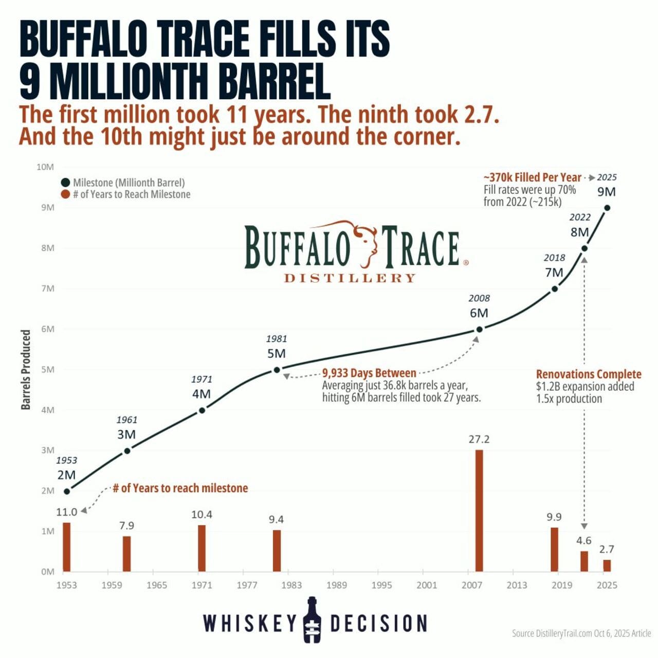 Suite au remplissage par Buffalo Trace de son 9 millionième fût, Whiskey Decision a réalisé une infographie illustrant l'évolution de sa production. On peut y voir que le 2e million avait nécessité 11 ans, tandis que le dernier million n'en a demandé que 2,7 ans. Autre fait notable : la distillerie a dû attendre 27 ans (1981-2008) pour passer de son 5e à son 6 millionième fût, reflétant une période durant laquelle le bourbon a traversé une crise profonde. Aujourd'hui, avec 370 000 fûts remplis par an (soit +70% par rapport à 2022), la capacité actuelle laisse envisager un 10e million dans moins de 3 ans - Source
