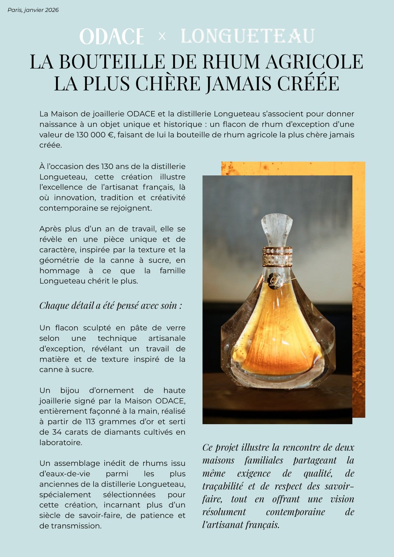 La Maison de joaillerie ODACE et la distillerie Longueteau s'associent pour donner naissance à un objet unique et historique : un flacon de rhum d'exception d'une valeur de 130 000 €, faisant de lui la bouteille de rhum agricole la plus chère jamais créée.