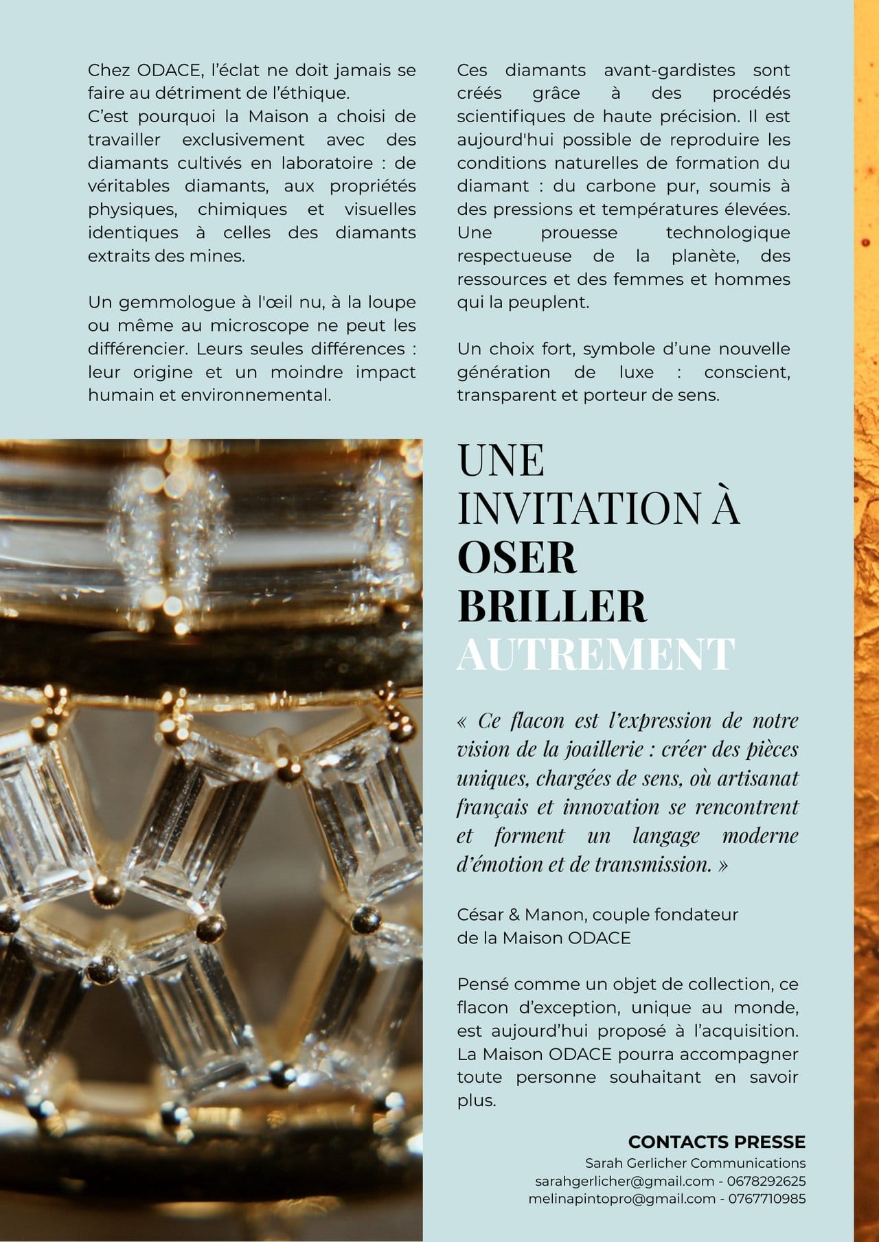 « Ce flacon est l'expression de notre vision de la joaillerie : créer des pièces uniques, chargées de sens, où artisanat français et innovation se rencontrent et forment un langage moderne d'émotion et de transmission. » - César & Manon, couple fondateur de la Maison ODACE