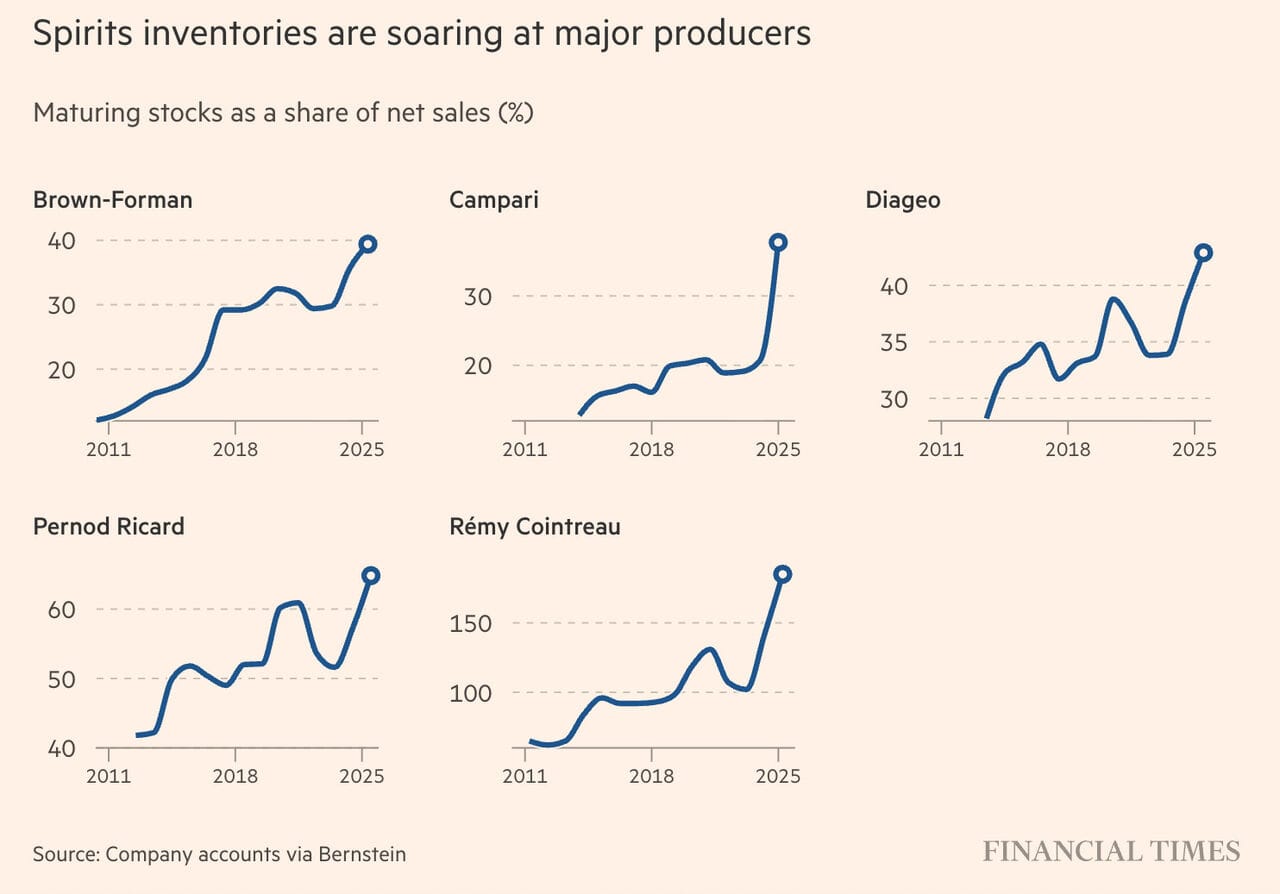 Selon le Financial Times, les cinq plus grands producteurs d'alcool cotés en bourse (Diageo, Pernod Ricard, Campari, Brown-Forman et Rémy Cointreau) détiennent désormais $22 milliards de spiritueux en vieillissement, un niveau record depuis plus d'une décennie. Cette surproduction, héritée du boom de la pandémie, pèse sur les bilans et menacerait à présent de déclencher une guerre des prix. Parmi les cas mis en avant, les stocks de Rémy Cointreau (€1,8 milliard) représenteraient presque le double de son chiffre d'affaires annuel - Source