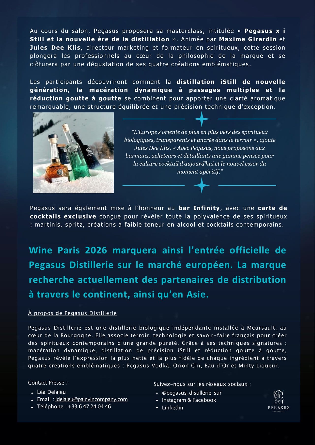 « L'Europe s'oriente de plus en plus vers des spiritueux biologiques, transparents et ancrés dans le terroir », ajoute Jules Dee Klis. « Avec Pegasus, nous proposons aux barmans, acheteurs et détaillants une gamme pensée pour la culture cocktail d'aujourd'hui et le nouvel essor du moment apéritif. »