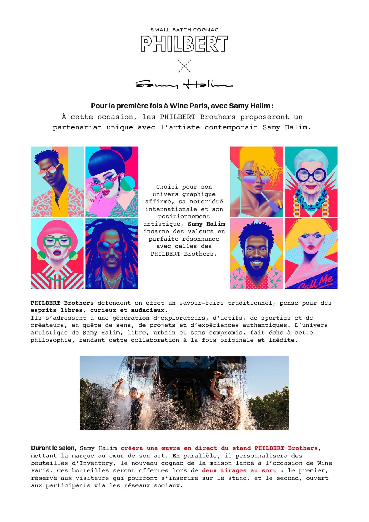 Durant le salon, Samy Halim créera une œuvre en direct du stand PHILBERT Brothers, mettant la marque au cœur de son art. En parallèle, il personnalisera des bouteilles d'Inventory, le nouveau cognac de la maison lancé à l'occasion de Wine Paris. Ces bouteilles seront offertes lors de deux tirages au sort : le premier, réservé aux visiteurs qui pourront s'inscrire sur le stand, et le second, ouvert aux participants via les réseaux sociaux.