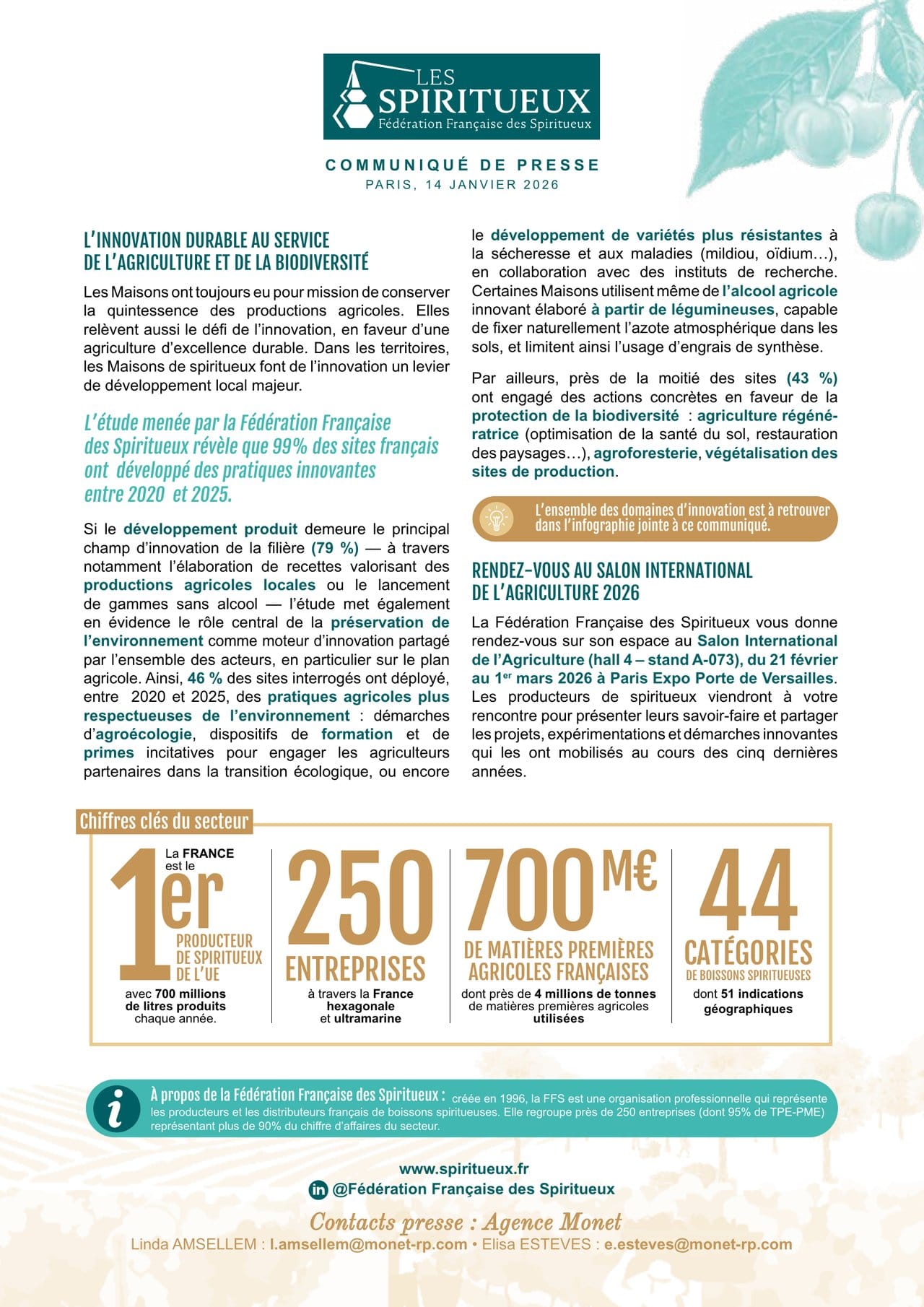 À l'occasion du Salon International de l'Agriculture 2026, la Fédération Française des Spiritueux (FFS) révèle les résultats de son étude menée en 2025 auprès de 252 sites de spiritueux, consacrée à l'innovation au sein de la filière française des spiritueux.