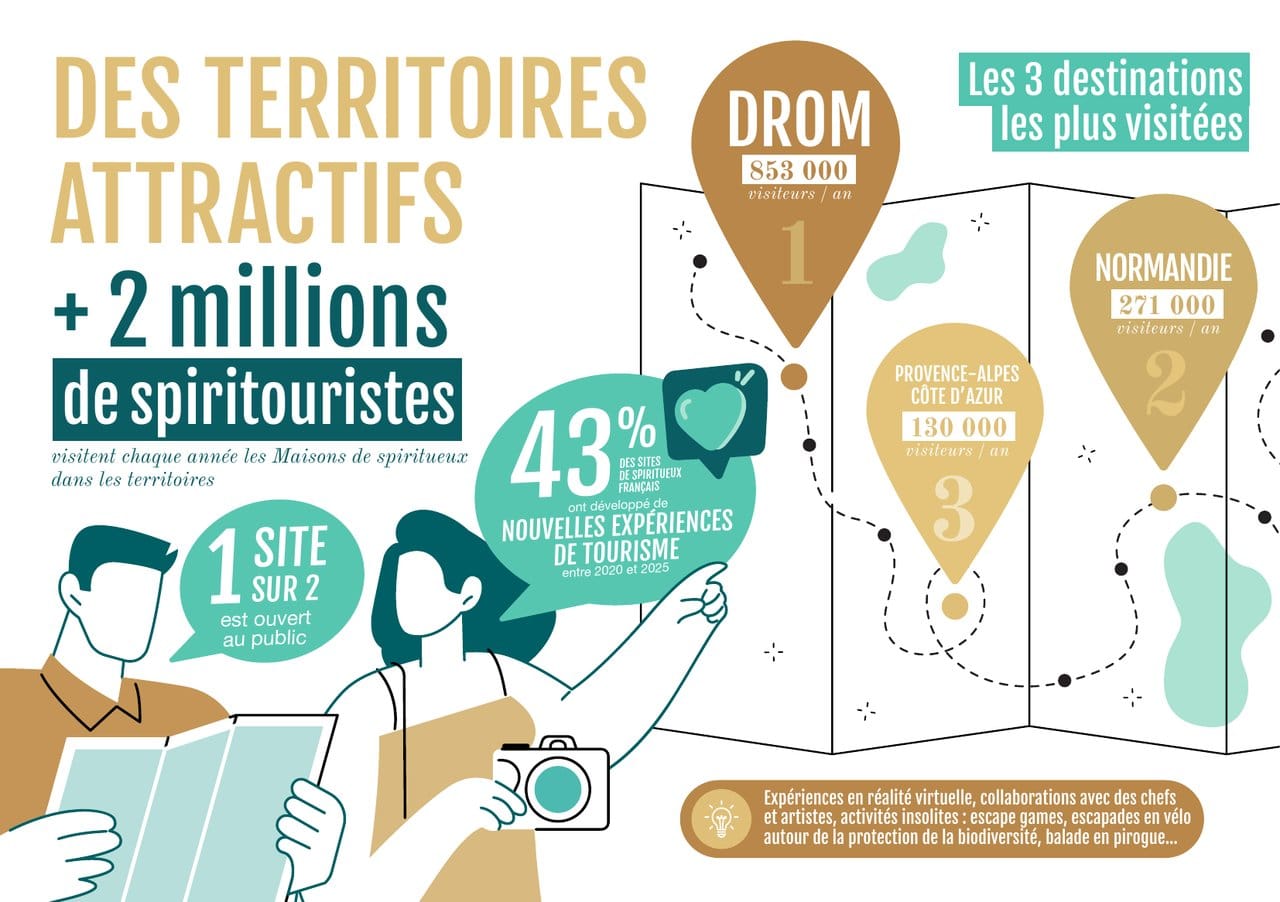 Cette dynamique contribue également à l'attractivité touristique des territoires : les Maisons de spiritueux accueillent en moyenne chaque année 2 millions de visiteurs, qui font vivre les territoires ultramarins (+850 000 visiteurs/an), mais aussi la Normandie (+270 000 visiteurs/an), la Provence-Alpes-Côte d'Azur (+130 000 visiteurs/an) et de nombreuses régions rurales.