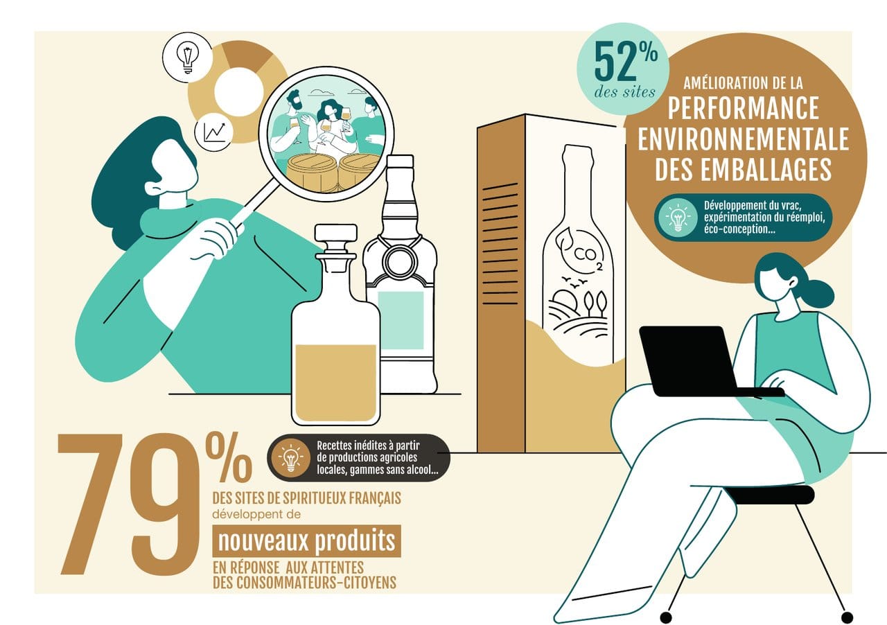Des initiatives durables fleurissent ainsi partout en France, chez des petits ou plus grands producteurs de Cognac, Armagnac, Calvados, rhum, liqueurs, eaux-de-vie de fruits, anisés, et depuis quelques années whiskies, gin et vodka.