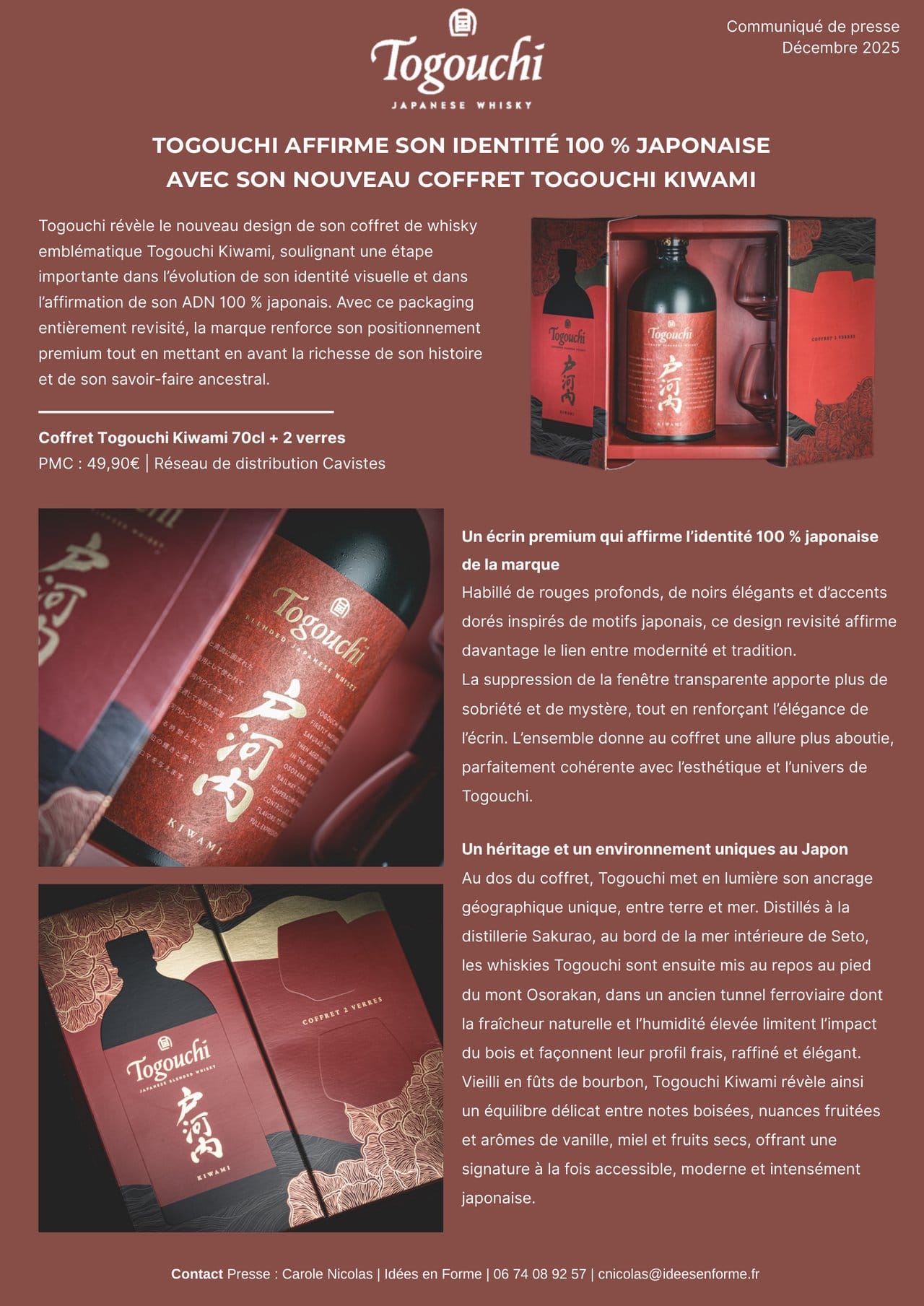 Togouchi révèle le nouveau design de son coffret de whisky emblématique Togouchi Kiwami, soulignant une étape importante dans l'évolution de son identité visuelle et dans l'affirmation de son ADN 100 % japonais. Avec ce packaging entièrement revisité, la marque renforce son positionnement premium tout en mettant en avant la richesse de son histoire et de son savoir-faire ancestral.