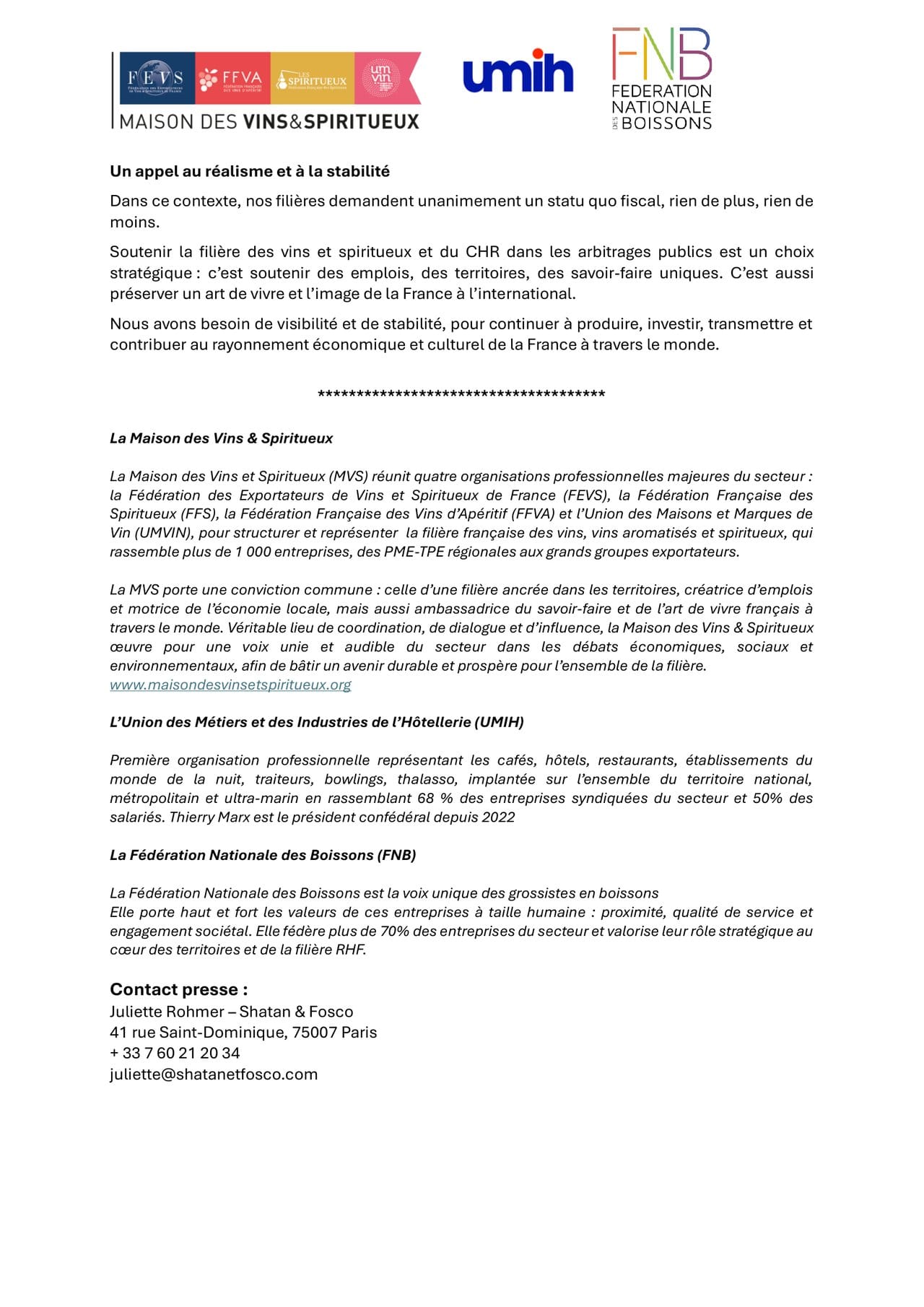 Nous avons besoin de visibilité et de stabilité, pour continuer à produire, investir, transmettre et contribuer au rayonnement économique et culturel de la France à travers le monde.
